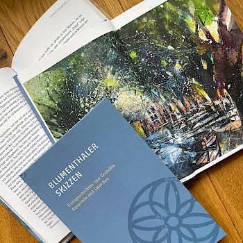Hier ein kleiner Einblick in unsere Arbeit und unsere „Produkte“: zwei Künstlerinnen-Bücher und zwei Lyrikbände und das Werkbuch "Blumenthaler Skizzen".