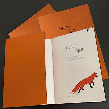 2021 war unser persönliches Jahr der Füchsin! In dem kleinen, feinen RISO DRUCK BÜCHLEIN „FREMDE SPUR“ nimmt die namenlose Füchsin die Witterung auf. Wen oder was wird sie finden, folgt sie der fremden Spur? Die liebevoll von UTE HASELMAIER gestalteten Fuchs-Illustrationen bringen uns einem zauberhaften Fuchswesen näher, die kurze Herz erwärmende Geschichte mit Happy End wird in neun HAIKU von SIMONE VÖHSE erzählt.